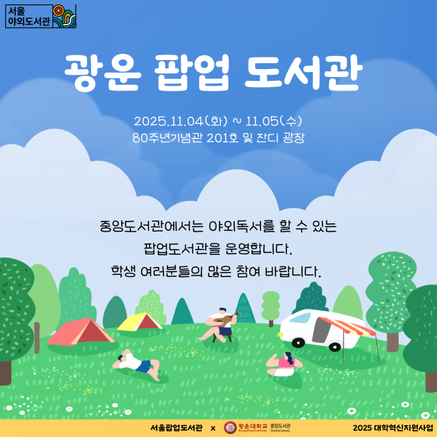 중앙도서관에서는 서울야외도서관과 함께 광운 팝업도서관 행사를 진행합니다.